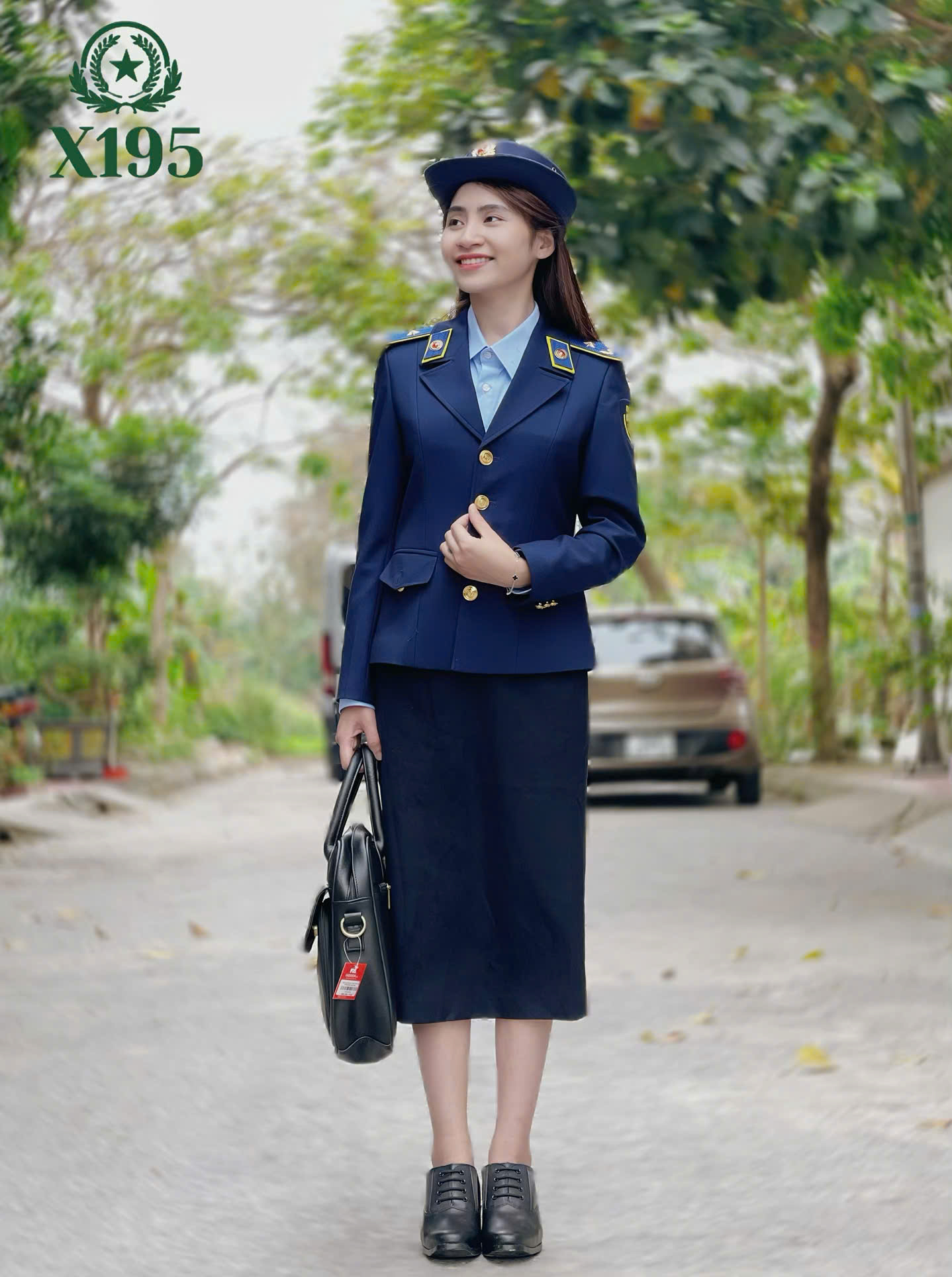 Màu sắc xanh đậm. Kiểu quần âu dài, có 2 túi chéo dọc quần, cửa quần khóa kéo. Thân trước xếp 1 ly lật về phía sườn. Thân sau chiết 1 ly, có 1 túi hậu. Cạp quần có 6 dây để luồn thắt lưng. Cạp quần có quai nhê.